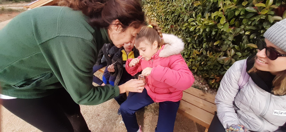 Després ens van explicar moltes coses sobre les abelles; que són de color marró i negre no pas grogues i negres com ens pensàvem, com fabriquen la mel, com són d'importants per la pol·linització de totes les flors.....També, mitjançant una petita escenificació, ens van ensenyar que no les havíem de tenir por, que havíem de parlar amb elles amb el cap i amb el cor.... I finalment vam fer un tastet de diferents mels, que bones que eren totes. Mmmmmm!!!